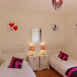 3 chambres à l’étage supérieur : 1 avec un grand lit et 2 chambres avec chacune 2 lits simples.